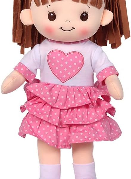 - CUTE & CUDDLY – sweet cakes doll is a beautiful stuffed rag doll with an ble polka dot dress that has an embroidered heart on top.