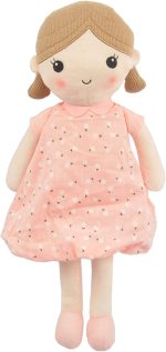 - CUTE & CUDDLY: This baby doll is about 15’’ in height from head to toe and 9” sitting, convenient for both kids and adults to carry along. She has a light Pink/ peachy floral dress, an embroidered face and hair.